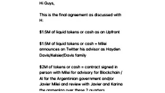 “Hola amigos. Este es el acuerdo final discutido con H. $1,5 M de tokens líquidos o cash como adelanto, $1,5M de tokens líquidos o cash = Milei anuncia en Twitter que su asesor es Hayden Davis/Kelsier/la familia Davis, $2M en tokens o cash = contrato firmado en persona con Milei por asesoria en blockchain/AI para el gobierno argentino y/o Javier Milei y revisión con Javier y Karina”,se puede leer en el documento.